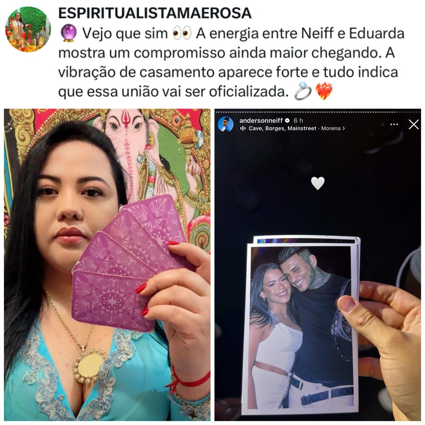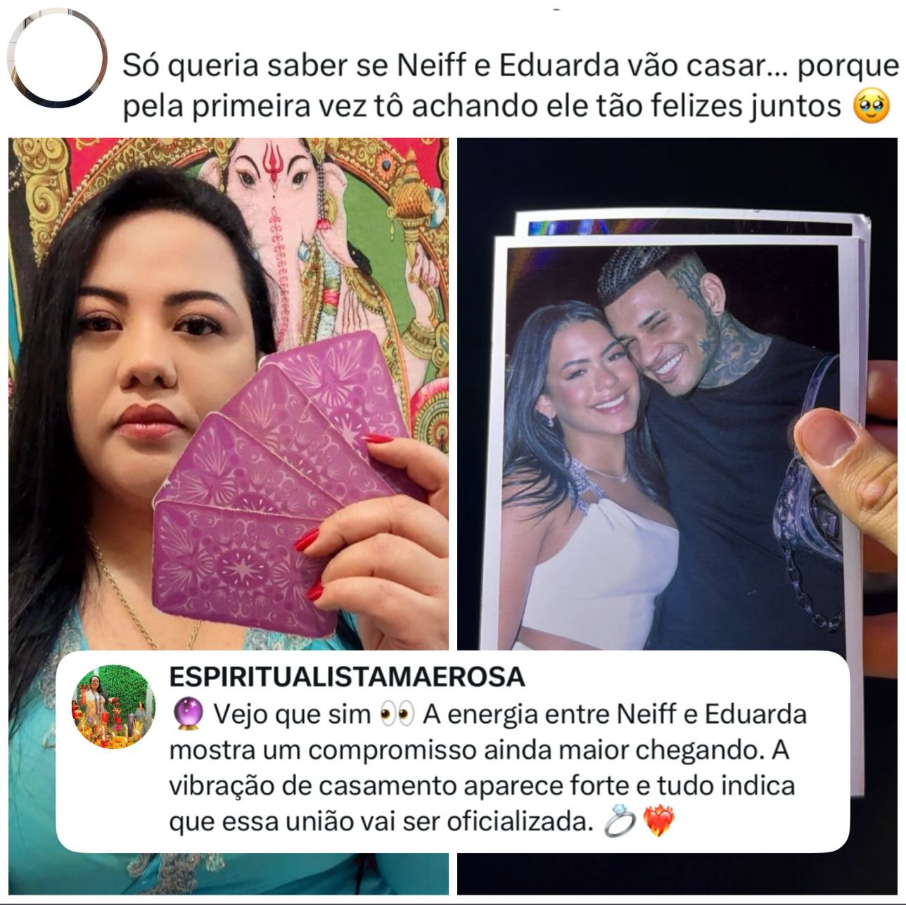 🚨 A renomada vidente dos famosos, @espiritualistamaerosa, compartilhou uma revelação incrível: ela vê o casamento no futuro de Neiff e Eduarda! 💍✨ Não é o momento exato, mas a energia desse casal está apenas se intensificando. Preparem-se para o que vem a seguir! 😱❤️