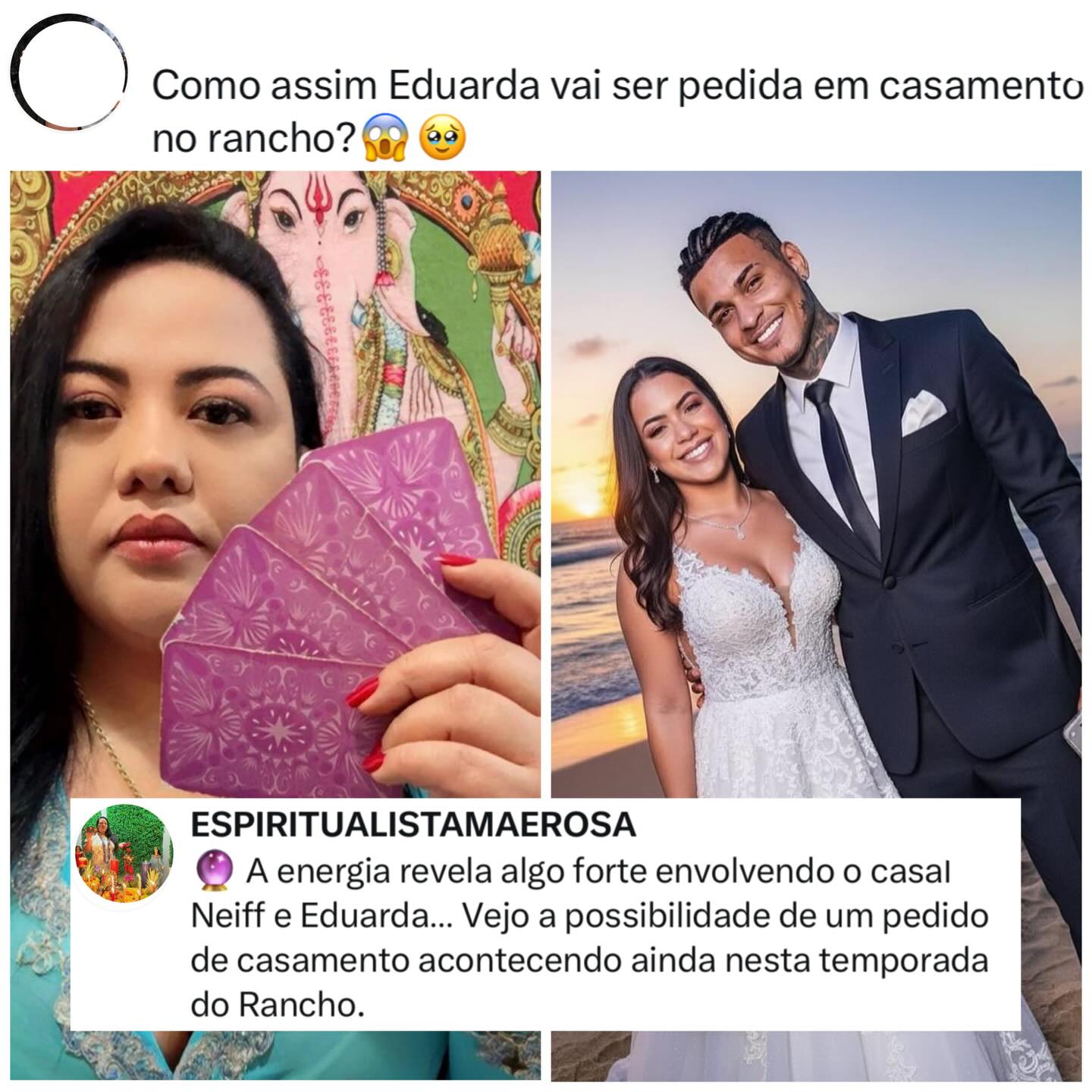 🚨 Preparativos a todo vapor para o CASAMENTO?! A renomada vidente @espiritualistamaerosa revelou que as energias estão favoráveis para um possível pedido de casamento de Neiff para Eduarda nesta temporada do Rancho! O que vocês acham?😍👏🏻 Mal podemos esperar!