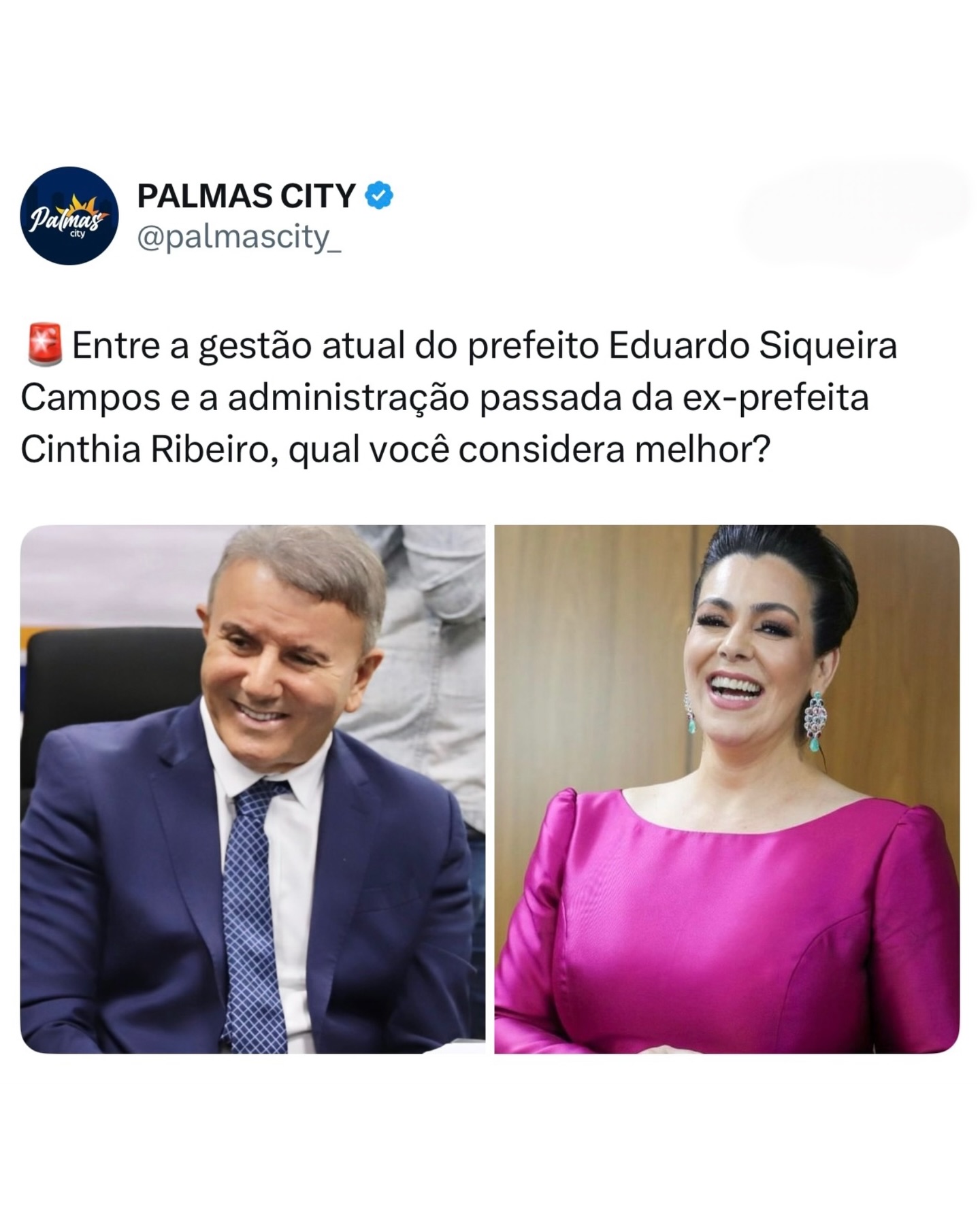 🌟 Comparação em Palmas! 🌟 Entre a gestão atual do prefeito Eduardo Siqueira Campos e a administração anterior da ex-prefeita Cinthia Ribeiro, qual você acha que fez mais pela nossa cidade? Deixe sua opinião nos comentários! 👇✨
