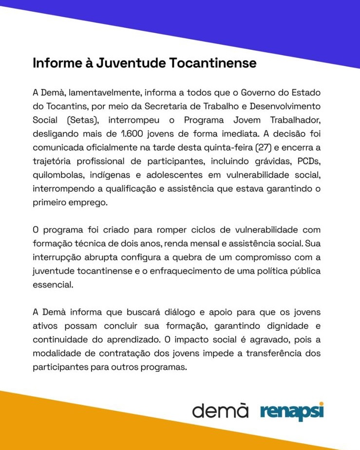 🚨 ATENÇÃO, TOCANTINS! 🚨 A Renapsi/Demà anunciou que o Governo do Estado interrompeu o Programa Jovem Trabalhador, desligando mais de 1.600 jovens imediatamente! 😔