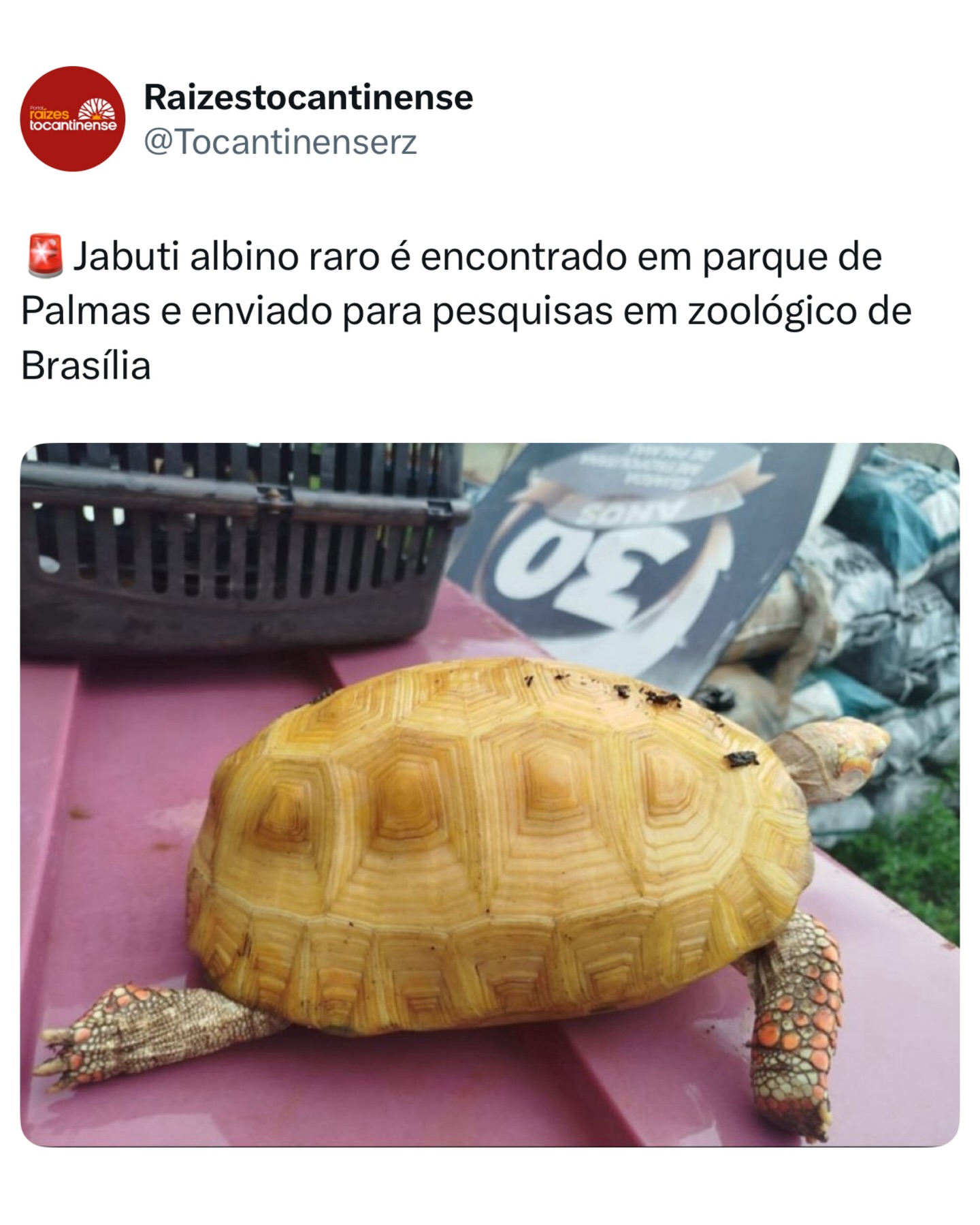 Um raro jabuti albino foi encontrado em Palmas, a capital do Tocantins! 🐢✨ Segundo a equipe da Guarda Metropolitana (GMP), este réptil extraordinário será levado ao Zoológico de Brasília para estudos mais aprofundados.