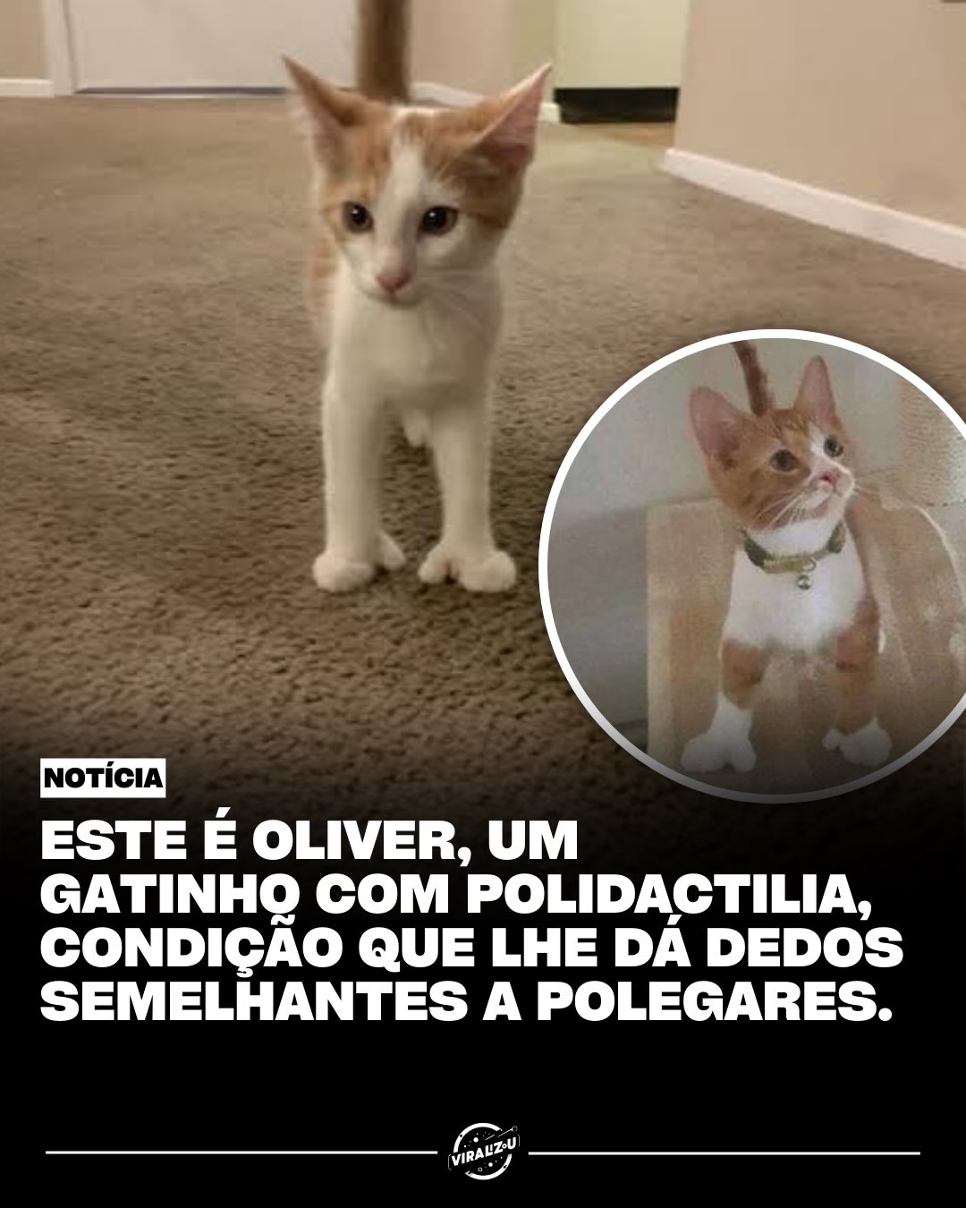 ✨ Conheça o Oliver! ✨ Este adorável gatinho é uma verdadeira estrela, e não só pelo seu jeitinho fofo. Ele nasceu com polidactilia, o que significa que tem dedinhos extras nas patas, quase como pequenos “polegares”! 🐾